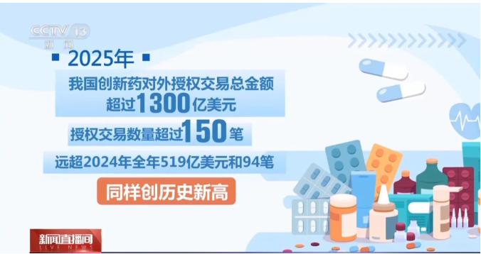 记者从国家药监局还获悉,2025年我国创新药对外授权交易总金额超过1300亿美元,授权交易数量超过150笔,远超2024年全年519亿美元和94笔,同样创历史新高。我国在研新药管线约占全球30%,位列全球第二。
